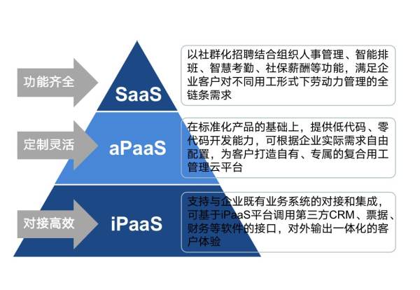 以SaaS+aPaaS+iPaaS满足企业客户在组织架构管理、用工结构管理等方面灵活定制与高效对接需求,将业务数据与人力成本联动,帮助企业动态优化用工结构,节约人力成本、提高用工人效。