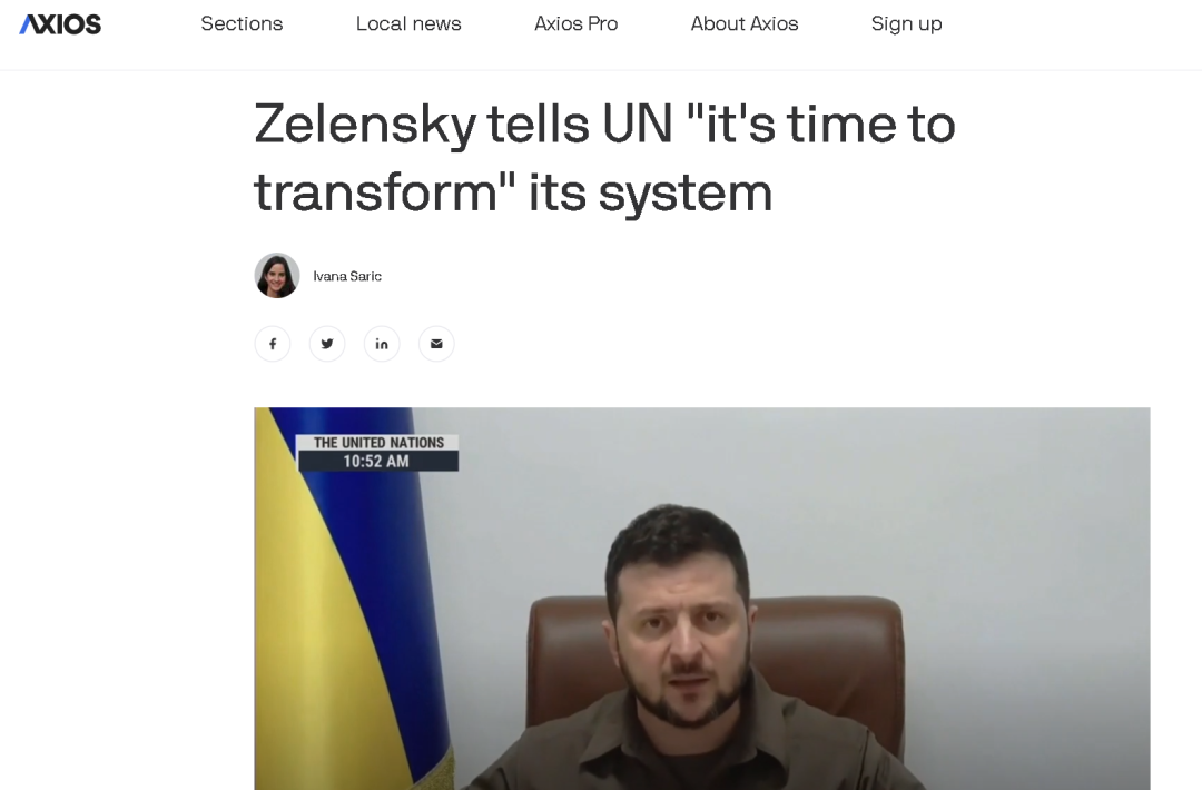 从美国AXIOS新闻网的报道来看,泽连斯基是在谈及发生在乌克兰布恰的平民死亡事件时抛出这些说法的,他当时激动地表示,眼下首要的工作就是去改变联合国的体制,因为俄罗斯对乌克兰发动的军事行动“显然”证明了联合国无法履行其制止国际入侵的首要职责。他称必须通过改革建立真正有效的联合国体制,阻止侵略并强制侵略者选择和平,才能维护和平。