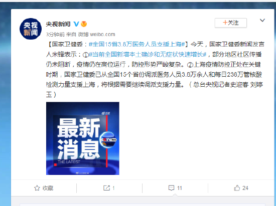 本文标题: 国家卫健委:全国15省3.8万医务人员支援上海
