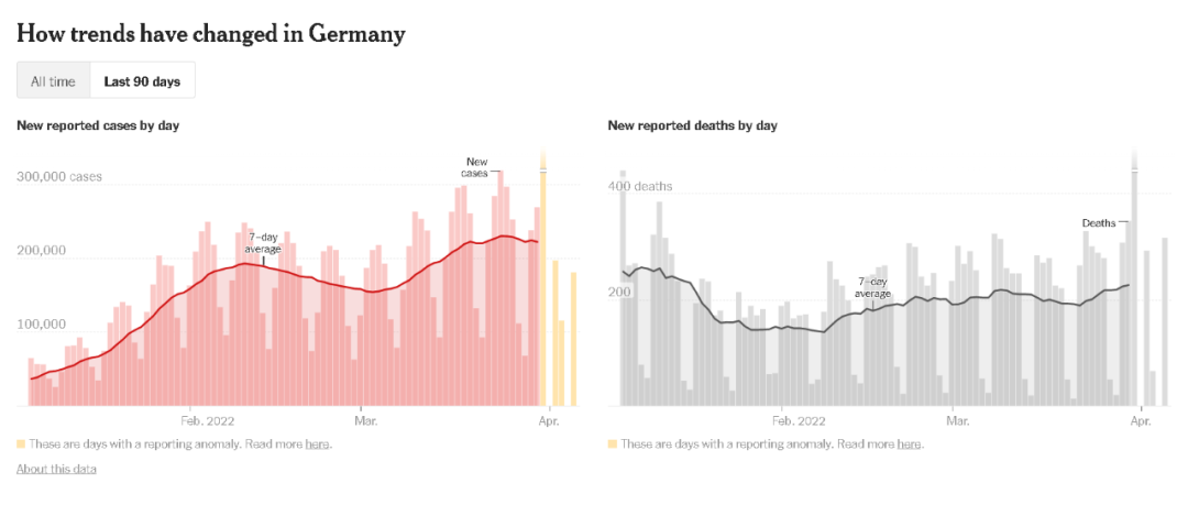 另外,美国《纽约时报》提供的数据显示,德国最近新冠病例确诊人数出现了增加的趋势。死亡病例也略有攀升。