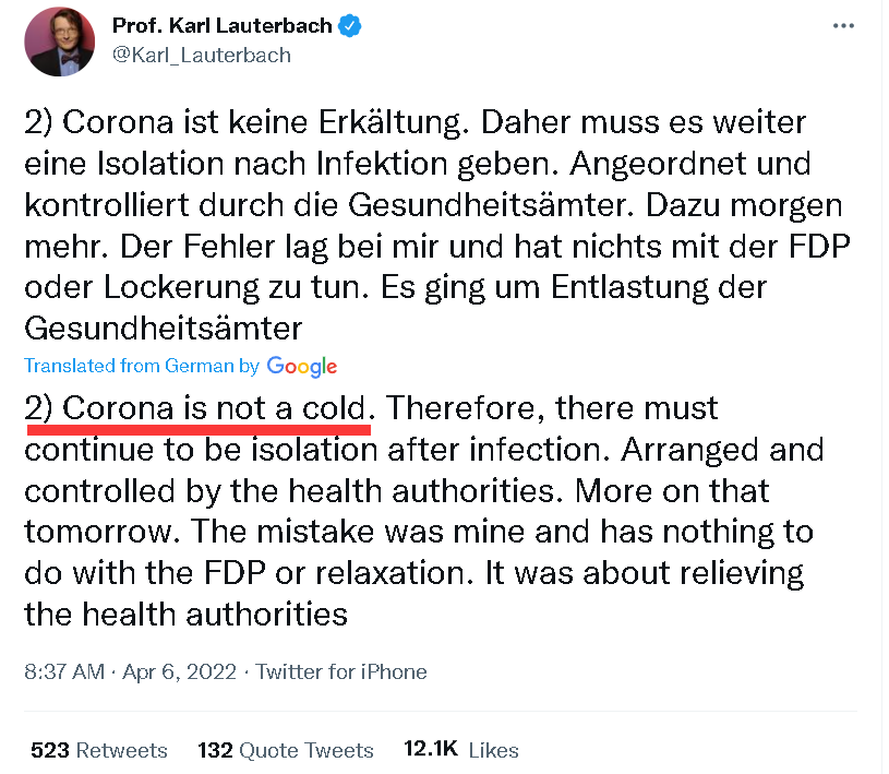 可本周二,德国卫生部长卡尔·劳特巴赫在德国电视二台上却突然宣布,德国不会在5月1日之后那么做了,仍会继续延续阳性病例强制隔离的政策,只不过时长从10天减为5天。而后,劳特巴赫还于周三在自己的社交账号上发帖,详细阐述了他改变政策的原因。