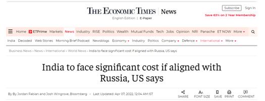 迪斯继续透露,美国已告诉印度,(印度)与莫斯科“更明确的战略结盟”后果将是“严重且长期的”。