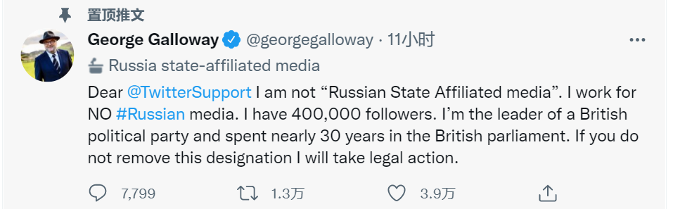 在多次转发涉俄言论后,英国前议员乔治·加洛韦(George Galloway)的推特账号被打上“俄罗斯国家附属媒体”标签。6日,他在推特发文称,“我不是‘俄罗斯国家附属媒体’,也没有为俄罗斯媒体工作。我有40万粉丝。我在英国议会工作了近30年。如果你们不删除名称,我将采取法律行动。”