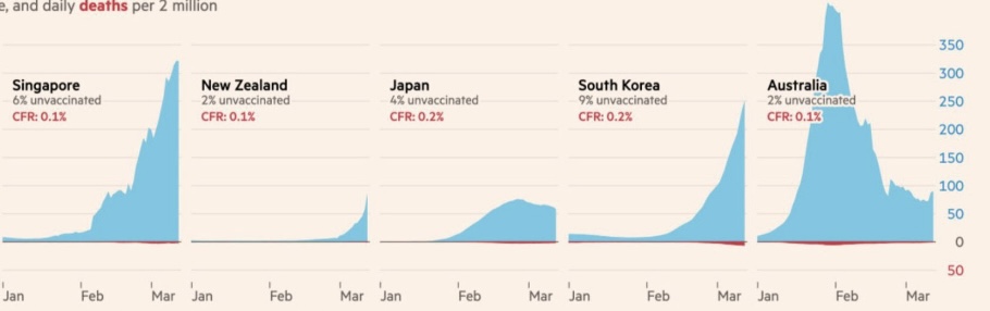 另据约翰霍普金斯大学提供的亚太地区其他国家的今年前三个月的新冠病死率数据,接种疫苗后可大幅降低病死率。新加坡、新西兰和澳大利亚的新冠病死率为0.1%,新加坡未接种疫苗的人口比例为6%,新西兰和澳大利亚仅2%的人口未接种疫苗;日本和韩国的新冠病死率为0.2%,日本有4%的人口未接种疫苗;韩国有9%的人口未接种疫苗。