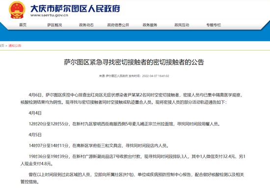 4月6日,萨尔图区疾控中心排查出红岗区无症状感染者尹某某2名同时空密切接触者,密接人员均已集中隔离医学观察,核酸检测结果均为阴性。现寻找与密切接触者同时空接触或轨迹重合人员。现将密接人员的部分活动轨迹通告如下: