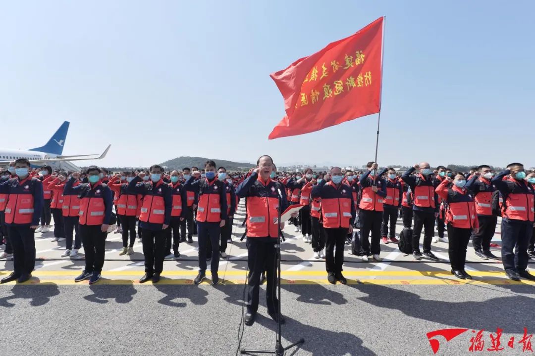 福州长乐国际机场阳光灿烂、晴空万里,“福建省支援上海防控新冠疫情医疗队出征仪式”的横幅格外醒目,整装待发的白衣战士精神抖擞、士气高昂,郑重宣誓:弘扬“敬佑生命、救死扶伤、甘于奉献、大爱无疆”的职业精神,全力救治患者,勇于担当、不辱使命。