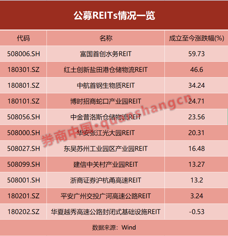 2021年6月,首批基础设施公募REITs在沪深交易所上市,标志着公募REITs试点正式启动。截至4月6日,全市场已经有11只公募REITs产品上市,其中首批9只产品的场内涨幅均超过了10%,最高一只富国首创水务REIT成立至今的涨幅近60%。