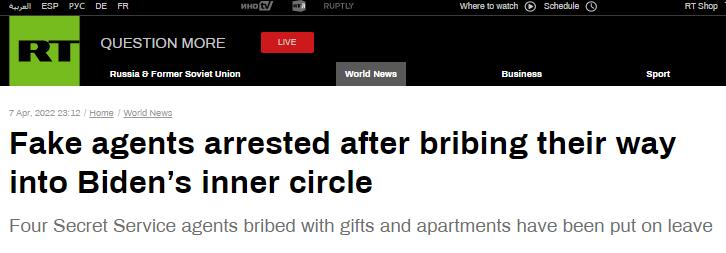 【环球网报道】“假特工通过贿赂打入拜登核心圈”,“今日俄罗斯”7日报道称,美国第一夫人吉尔·拜登身边的四名美国特勤局特工在过去两年间收受了来自“美国国土安全部两名特工”送的枪支、免费公寓等礼物。而更让人大跌眼镜的是,这两名“特工”被指是假冒的,已于6日被捕,7日在联邦法院被控虚假冒充美国官员。