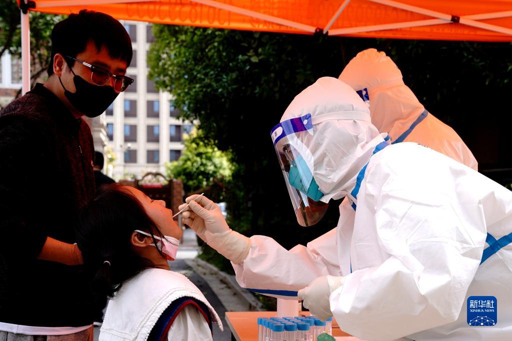 4月9日,在上海松江区中海悦庭小区,洞泾镇社区卫生服务中心医务人员为居民进行核酸采样。新华社记者 张建松 摄