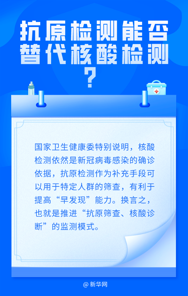 为进一步优化新冠病毒检测策略,国务院联防联控机制综合组日前决定在核酸检测基础上,增加抗原检测作为补充。国家卫生健康委特别说明,核酸检测依然是新冠病毒感染的确诊依据,抗原检测作为补充手段可以用于特定人群的筛查,有利于提高“早发现”能力。