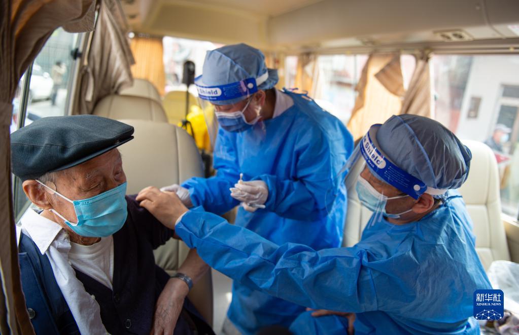 4月9日,老人在流动疫苗接种车里接种新冠疫苗。当日,一辆流动疫苗接种车开进了北京市朝阳区呼家楼街道的向军北里小区,为小区及周边的老年人提供新冠疫苗就近接种服务。新华社记者 陈钟昊 摄