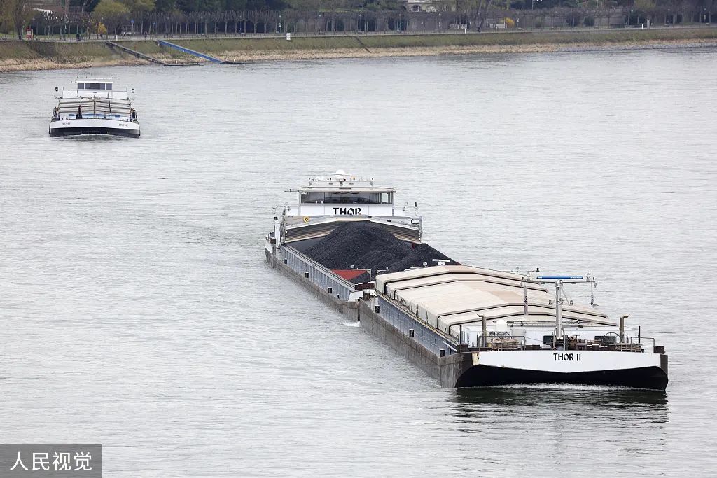 当地时间2022年4月8日,德国波恩,船载着煤炭行驶在莱茵河上。