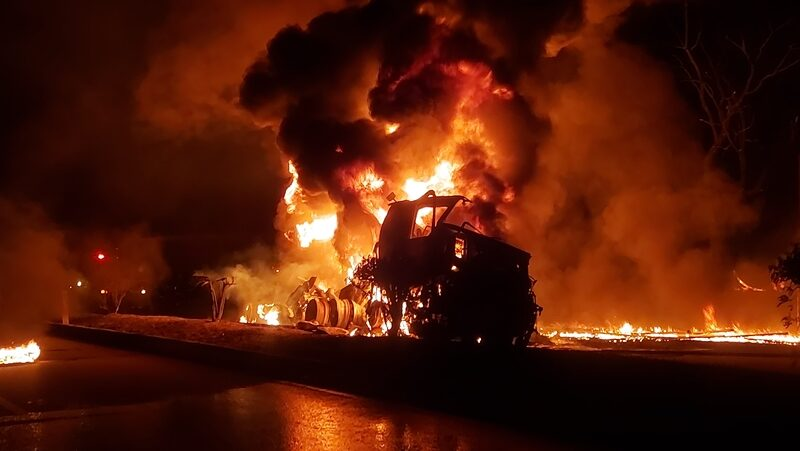 当地时间12日3时30分,泰国北部达府一条公路上的一辆油罐车追尾一辆运送钢材的大卡车,碰撞引发的火花导致载有4万升油料的油罐车起火并发生爆炸,火势迅速蔓延并对附近居民区造成威胁。