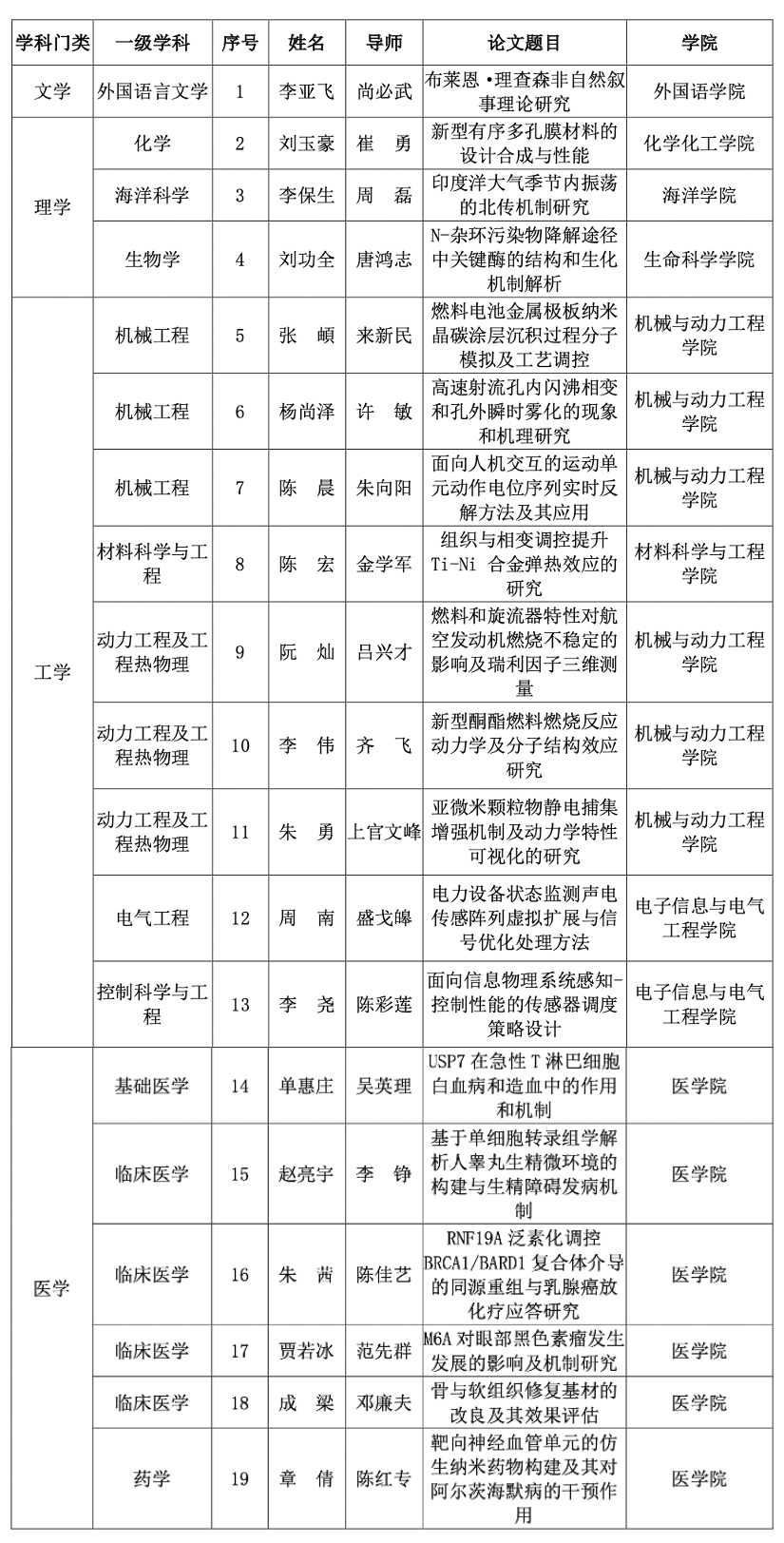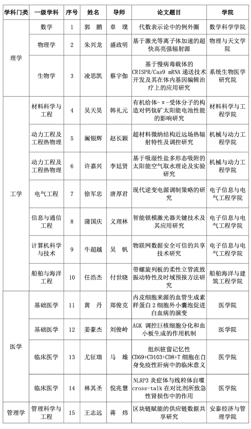 为激励博士生专注于高水平、创新性科学研究,鼓励导师对博士研究生的悉心指导与精心培养,建立崇尚学术、勇于创新的氛围和导向,进一步提高博士学位论文质量,学校于2021年底启动第六届优博论文评选工作。经规定程序评审,确定《代数表示论中的例外圈》等15篇论文为上海交通大学2021年优秀博士学位论文,《布莱恩·理查森非自然叙事理论研究》等19篇论文为上海交通大学2021年优秀博士学位论文提名论文,现予以公布。