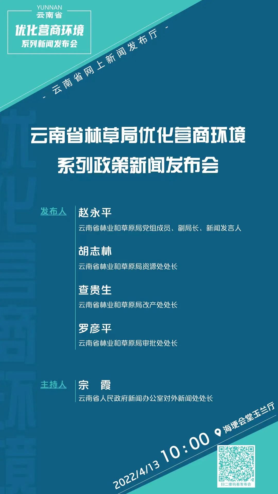 4月13日上午,云南省人民政府新闻办公室在海埂会堂召开云南省林业和草原局优化营商环境系列政策新闻发布会,介绍相关情况并回答记者提问。