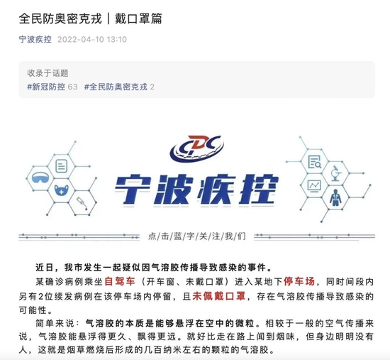 4月10日,浙江宁波市疾控中心发布,当地某确诊病例乘坐自驾车(开车窗、未戴口罩)进入某地下停车场,同时间段内另有2位续发病例在该停车场内停留且未戴口罩,存在气溶胶传播导致感染的可能性。