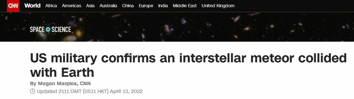 CNN:美国军方证实一颗星际流星与地球相撞