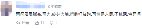 还有网友直斥,“三立及民进党,玩火,终必自烧,捞饱好络跑(逃跑),可怜是岛内民众,不挑衅,会死吗?”↓