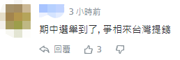 针对美参议员窜访团可能将于今晚抵台,有岛内网友讽刺,“(美国)期中选举到了, 争相来台湾提钱”。↓