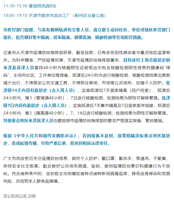 记者另从天津市疫情防控指挥部获悉,截至目前,已有多名阳性感染者与重点地区返津有关。为科学精准、严防疫情反弹,天津市疫情防控指挥部重申,具有途经上海市旅居史的来津及返津人员需持48小时内核酸阴性证明或出示包含核酸检测阴性信息的健康码“绿码”,主动向社区、工作单位等报备,抵津后24小时内进行核酸检测,核酸检测结果出具前减少出行,不得乘坐公共交通工具,不得前往商场、市场等公共场所,加强个人防护。抵津前14天内具有旅居史(含入境人员),实施抵津后7天居家隔离(同户同室),抵津后24小时内、第3(管理满48小时)、7日进行核酸检测,检测结果为阴性可解除管理。抵津前7日内具有旅居史(含入境人员),实施抵津后7天集中隔离及7日居家医学观察,抵津后24小时内、第3(隔离满48小时)、7、14日进行核酸检测,检测结果为阴性可解除管理。其他重点地区来津返津人员也要按照市疫情防控指挥部的要求严格落实报备、管控措施。