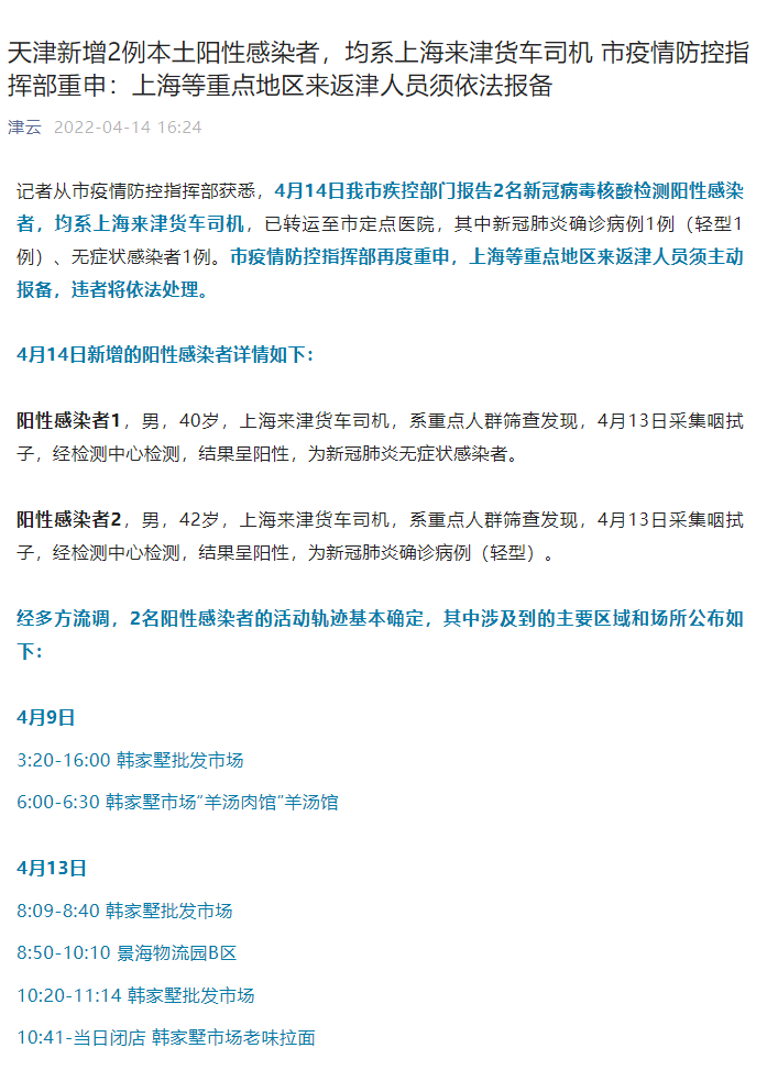 记者从天津市疫情防控指挥部获悉,4月14日天津市疾控部门报告2名新冠病毒核酸检测阳性感染者,均系上海来津货车司机,已转运至天津市定点医院,其中新冠肺炎确诊病例1例(轻型1例)、无症状感染者1例。(记者郭方达、张建新)