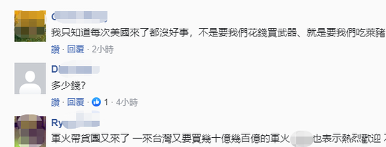 还有台媒统计各大新闻网站评论区后注意到,多数岛内民众都质疑这次会面会不会跟“卖武器”有关。“我只知道每次美国来了都没好事,不是要我们花钱买武器,就是要我们吃莱猪!”“多少钱?”“军火带货团又来了,一来台湾又要买几十亿的军火,民进党当局还表示热烈欢迎”。