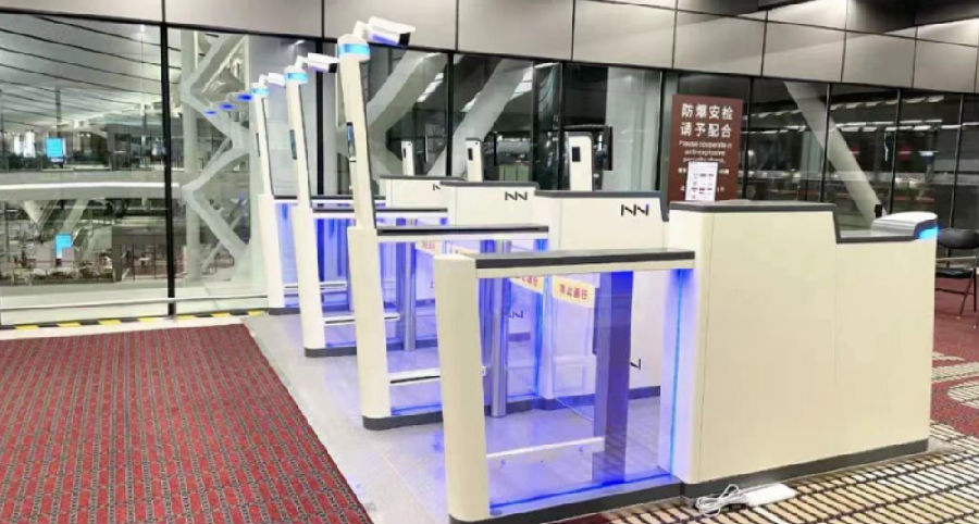 中国电子旗下中电圣非凡的一款自助防爆测温闸机在哈尔滨太平国际机场、北京大兴国际机场、首都国际机场、天津滨海国际机场、呼伦贝尔东山国际机场等场所投入试用,为繁忙的机场筑起第一道安全屏障。这款新型自助防爆测温闸机融合了无感防爆、黑体在线校正测温、智能生物识别、防尾随跟踪控制等多项高新科技。旅客到达航站楼后,只需在闸机口将身份证放到证件扫描区域,摄像头会即刻“刷脸”开启人员身份核验,并同时启动无接触红外测温、个人健康码最新状态自动匹配、爆炸物检测和重点人员筛查等多项检测。经测算,携带行李旅客平均过检时间为8秒左右,未携带行李的旅客仅需5-6秒。新型自助防爆测温闸机可大大简化检测流程,显著提升检测效率,解决了工作人员与受检旅客近距离接触、待检旅客聚集排队的问题,真正实现“1米安全距离”,降低交叉传染的风险隐患。