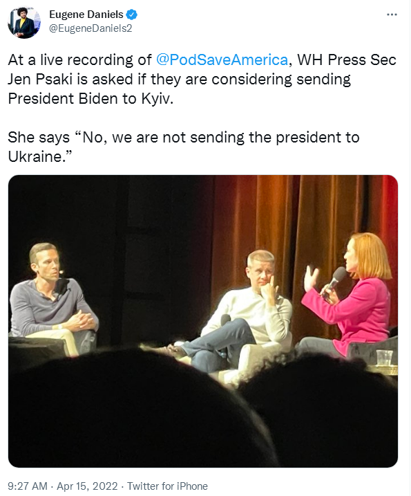当地时间4月14日,美国政治新闻网白宫记者尤金丹•尼尔斯(Eugene Daniels)在社交媒体推特上发文写道:“在‘豆荚拯救美国’(PodSaveAmerica)的现场录音中,普萨基被问及白宫是否正在考虑派拜登总统去基辅。她说:‘不,我们不会派总统去乌克兰。’”