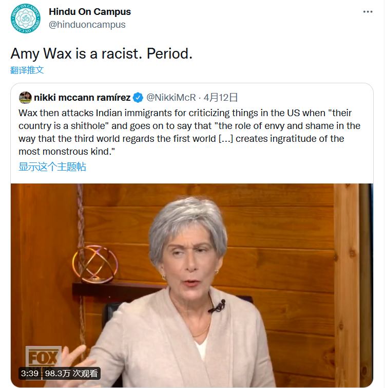 “艾米·瓦克斯就是个种族主义者。”印度校园组织(Hindu On Campus)在推特上写道,该组织致力于打击美国学校的反印度偏见。