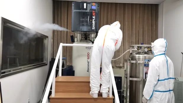 3月22日,三台核磁共振仪面临第一次失“血”失“气”状态的挑战。中药研究所和创新中药研究院联合向学校提出了给核磁共振仪添加液氮的申请。校疫情防控领导小组紧急召开联席会议讨论研究,科技处、保卫处、后勤保障处指导和协调组织,在做好周密防疫消毒方案的前提下,中药研究所侯茂奇、创新中药研究院付建国、叶文博等值守老师提前做好场地准备,协助入校的液氮供应公司工程师为仪器补加液氮,平稳渡过了第一次失“血”失“气”的难关。