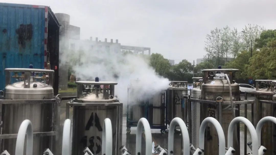 4月13日,施松善老师紧急联系到上海氯闵气体有限公司,满载4000升液氮的专用卡车经过层层严格检查后于下午2点抵达蔡伦路1200号学校门口。校保卫处对卸载在校门口的20个液氮罐进行全面彻底消杀,并在室外停放6小时后,由各学院驻校值守老师组成的志愿者身着资产管理处紧急调配的大白防护服,顶着大雨,纷纷出现在校门口到各实验室的路上,将重达数百公斤的液氮罐逐一搬运到核磁室及其它指定场所。面对排放整齐、静置消杀的液氮罐,在场的志愿者和场外远程监控进程的老师们热泪盈眶,激动不已。
