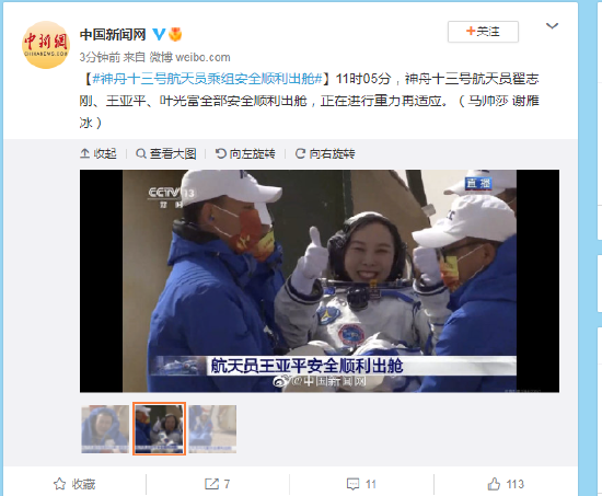 11时05分,神舟十三号航天员翟志刚、王亚平、叶光富全部安全顺利出舱,正在进行重力再适应。(马帅莎 谢雁冰)