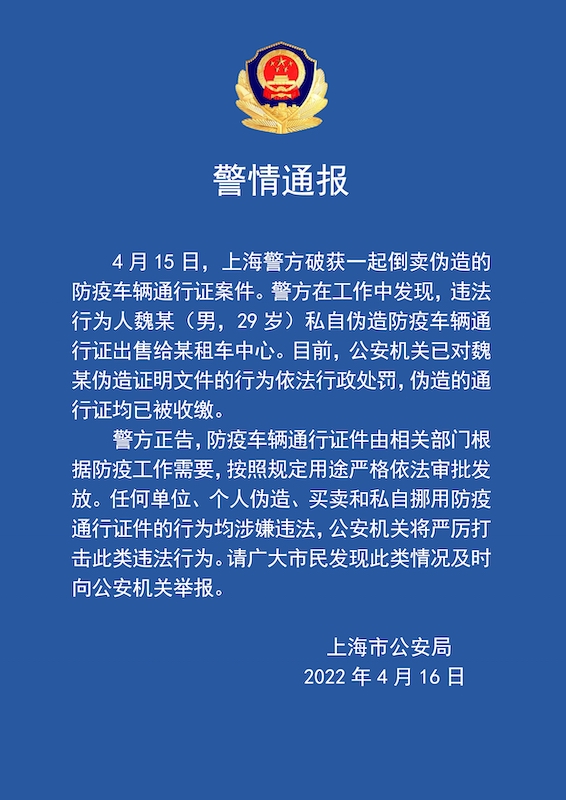 2022年4月15日,上海警方破获一起倒卖伪造的防疫车辆通行证案件。警方在工作中发现,违法行为人魏某(男,29岁)私自伪造防疫车辆通行证出售给某租车中心。目前,公安机关已对魏某伪造证明文件的行为依法行政处罚,伪造的通行证均已被收缴。