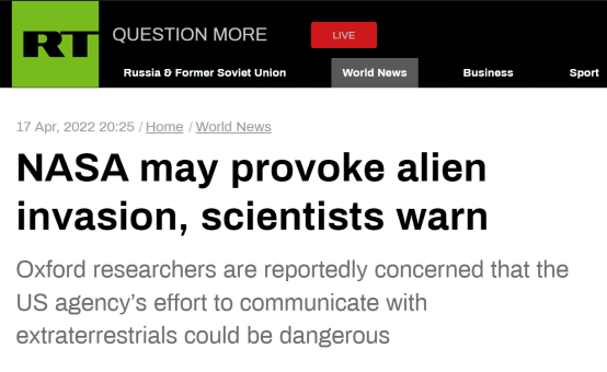 【环球网报道 记者 张晓雅】“科学家们警告,美国国家航空航天局(NASA)(的计划)可能会引发外星人入侵。”“今日俄罗斯”(RT)17日以此为题的报道称,英国牛津大学的科学家们对NASA向太空广播位置数据和其他信息的计划发出警告,认为相关计划可能会产生危险的意外后果,包括引发外星人入侵。
