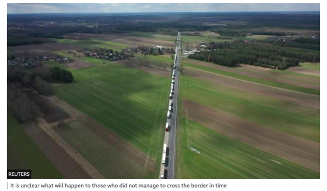 路透社发布的无人机视频显示,随着午夜截止日期的临近,道路上仍然排着长长的车队。路透社报道援引一名白俄罗斯司机的话说,“还有很多公里要开……所以这是不现实的。”