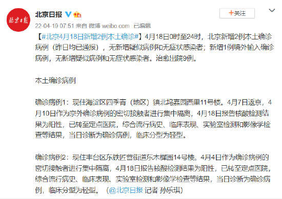 确诊病例1:现住海淀区四季青(地区)镇北坞嘉园西里11号楼。4月7日返京,4月10日作为京外确诊病例的密切接触者进行集中隔离,4月18日报告核酸检测结果为阳性,已转至定点医院,综合流行病史、临床表现、实验室检测和影像学检查等结果,当日诊断为确诊病例,临床分型为轻型。