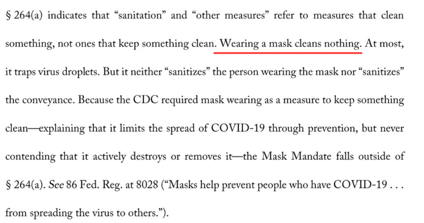 至于CDC颁布该强制令时依据的美国1944年的公共卫生服务法案,该法官则认定那条法律的字面意思是,卫生部门可动用行政力量对有传染性的物体进行消毒工作,而不是强制个人保持清洁。