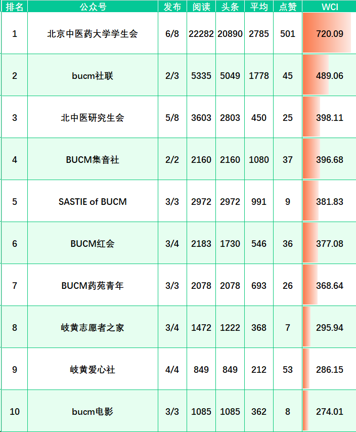北京中医药大学学生会以WCI指数720.09的分数荣登榜首,第二名与第三名分别是bucm社联(WCI指数489.06)和北中医研究生会(WCI指数398.11)