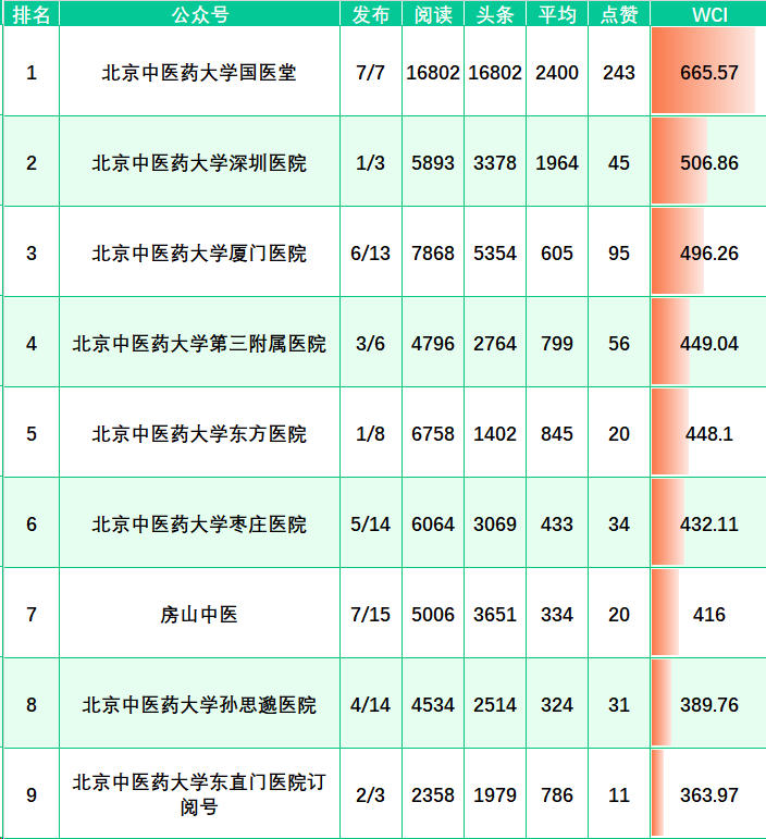 医疗机构的公众号们一直努力方便大家接受医疗服务、普及医学知识。本周北京中医药大学国医堂(WCI指数665.57)位居榜单第一,第二和第三分别是北京中医药大学深圳医院(WCI指数506.86)和北京中医药大学厦门医院(WCI指数496.26)。