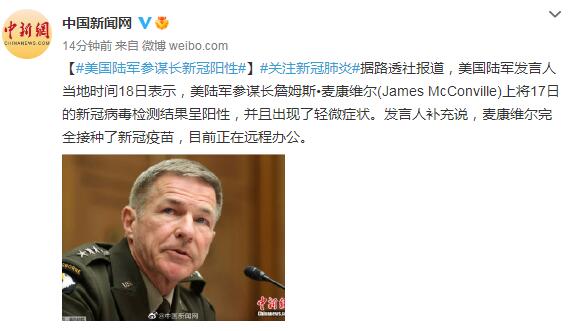 据路透社报道,美国陆军发言人当地时间18日表示,美陆军参谋长詹姆斯•麦康维尔(James McConville)上将17日的新冠病毒检测结果呈阳性,并且出现了轻微症状。发言人补充说,麦康维尔完全接种了新冠疫苗,目前正在远程办公。