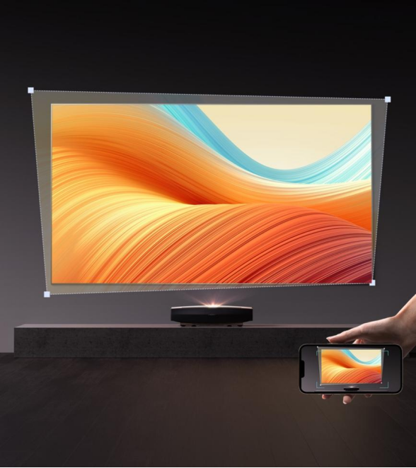 在日常使用上也更为人性化、智能化,无需手动调试,用户只需打开极米App,拍摄幕布位置,系统便能够自动将画面与幕布匹配,高效自动快捷方便。