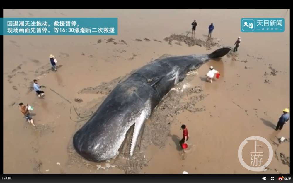 据直播现场天目新闻记者报道,由于渔政船无法靠近搁浅鲸鱼位置,已经返航,将等16:30涨潮后进行第二次救援。象山相关部门此前已派出五艘船进行救援。