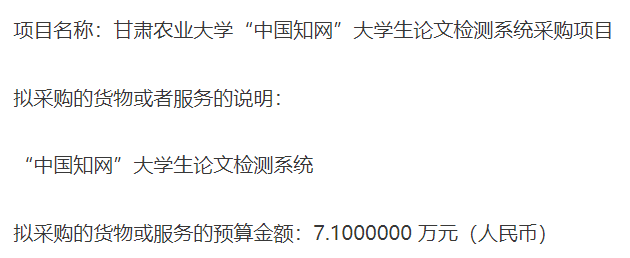中国政府采购网2022年4月18日发布消息显示,甘肃农业大学采购中国知网论文检测系统费用为7.1万元,主要用于本科毕业论文检测。