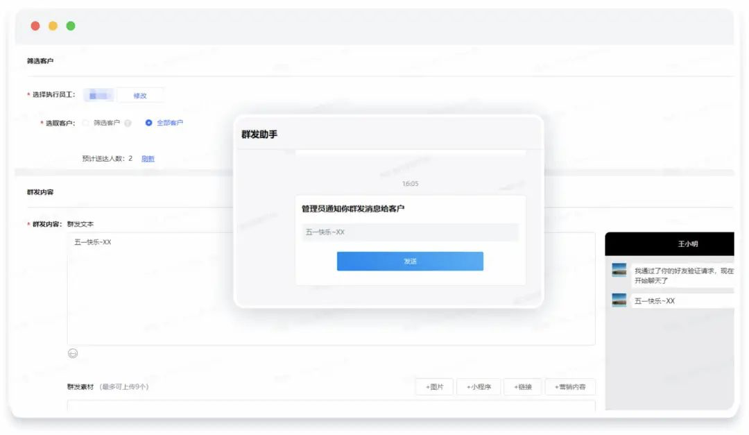 再利用探马的[客户群发]功能,配有转发语,直接下发“群发任务”。销售会在企微收到群发消息的提醒,点击即可发送给所有客户。