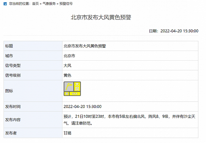 本文标题: 北京发布大风黄色预警:阵风8、9级,并伴有沙尘天气