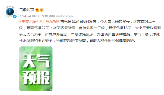 本文标题: 北京今天白天晴转多云,北转南风二三级,最高气温27℃