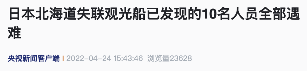 当地时间23日13时15分左右,一艘航行于日本北海道知床半岛附近海域的观光船因船头部分进水发生下沉,事发时船上载有26人。截至当地时间24日16时,该失联观光船上已有10人被发现。据日本海上保安厅有关人士透露,目前已发现的10名人员全部遇难。