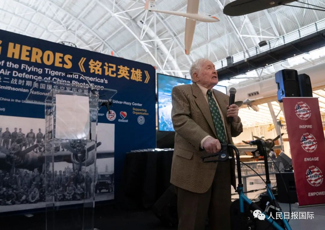 4月9日,“铭记英雄—纪念飞虎队80周年及二战时期美国援华空军历史图片展”在美国国家航空航天博物馆开幕。飞虎队老兵罗伯特·莫尔在图片展上讲话。新华社记者刘杰摄