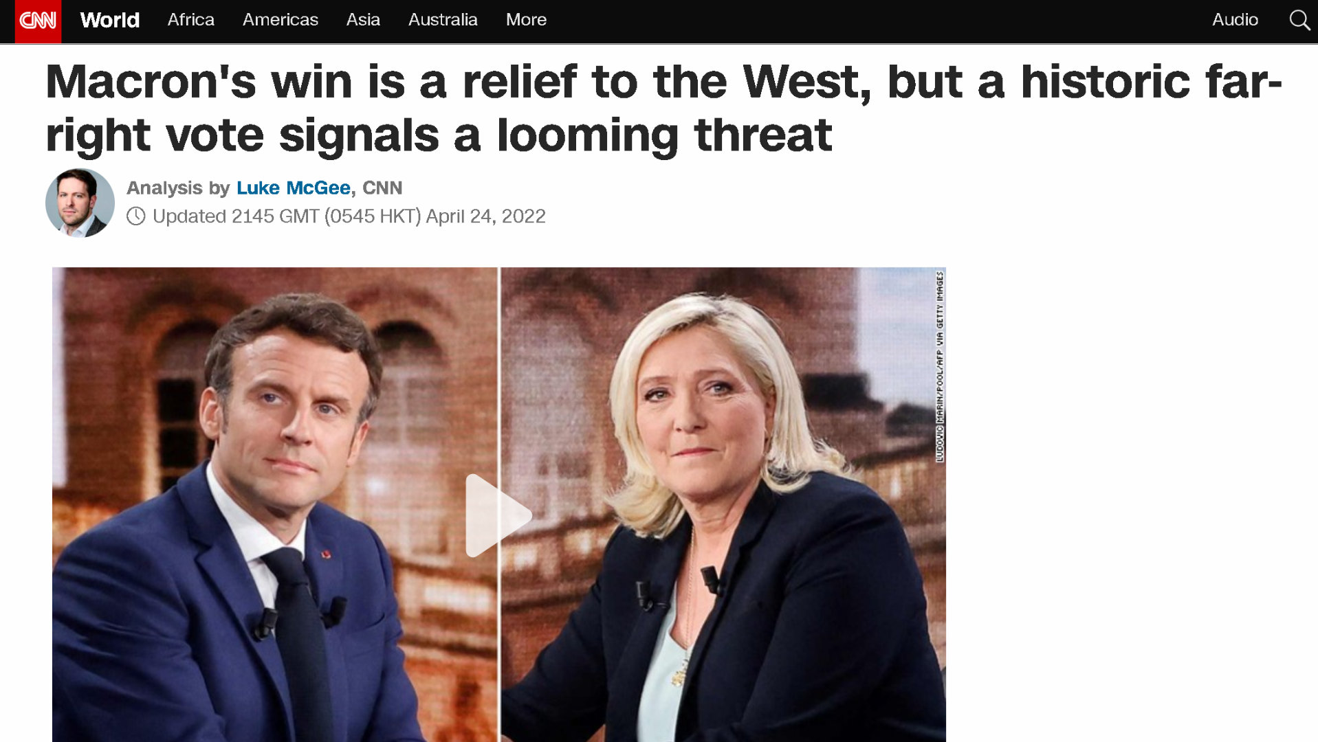 CNN由此认为,欧洲的领导人除了恭喜马克龙,也要警惕勒庞赢得的更多支持,否则下一个5年情况就可能真的不一样了。