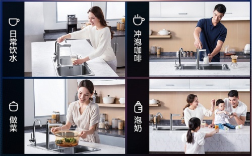能出净水又能出热水,不仅满足了平时的饮水需求,拥有1.8L每分钟的大流量热水,还满足在厨房里做饭、煲汤时,大锅接热水,速度又快量又大。专利高端温控龙头,可智控设定“98℃、90℃、80℃”三种不同温度开水,满足用户98℃泡红茶、90℃泡咖啡、80℃绿茶等多场景的开水需求,就连晚上熬夜工作、刷剧、游戏,随时来泡个杯面也一键搞定,为用户提供了更多的饮水便利。